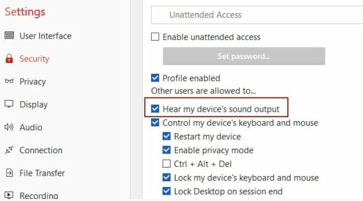 Additionally, access the "Security" tab and then navigate to both the "Unattended Access" and "Permissions for remote users" sections. Here, you should grant permission for other users to access and "Hear your computer's sound output".